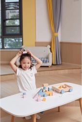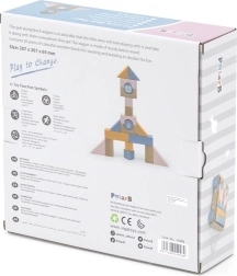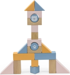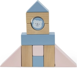 20 klocków w różnych pastelowych kolorach i kształtach wspiera kreatywne budowanie i rozwój zdolności manualnych.
