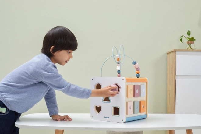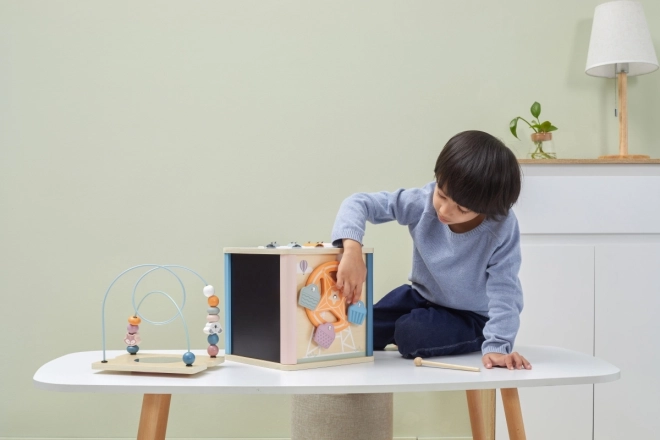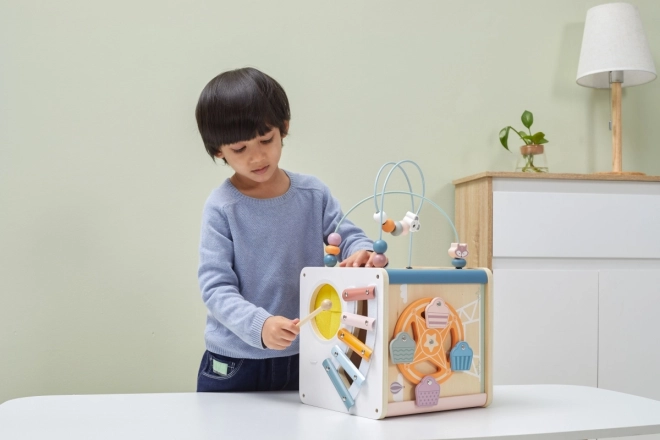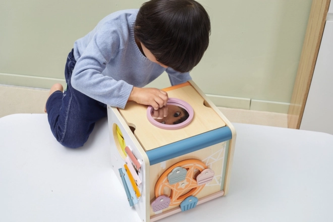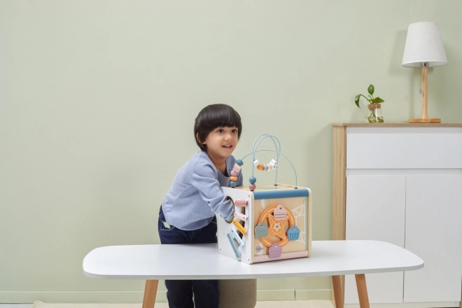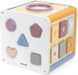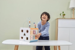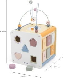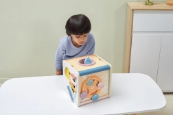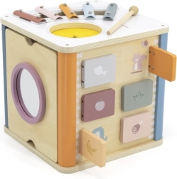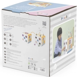 Viga PolarB Edukacyjna kostka 8w1 oferuje osiem różnych aktywności, które wspierają rozmaite aspekty rozwoju dziecka. Zabawka zawiera: