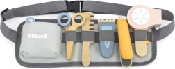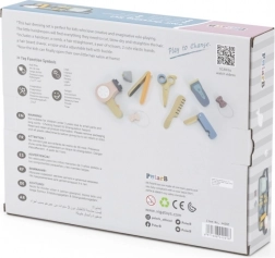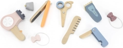 Ten zestaw fryzjerski został zaprojektowany tak, aby dzieci mogły rozwijać swoją kreatywność poprzez zabawę w odgrywanie ról. Zawiera różne drewniane narzędzia, takie jak suszarka, grzebień, prostownica do włosów, nożyczki, maszynka do golenia i brzytwa. Dzięki regulowanemu paskowi dzieci mają wszystko, co potrzebne, zawsze pod ręką. Wszystkie zabawki są bezpieczne i pomalowane nietoksycznymi farbami na bazie drewna.