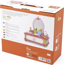 Piękna różowa toaletka marki Viga jest idealnym uzupełnieniem każdego dziecięcego pokoju. Zestaw zawiera lustro, wysuwaną szufladę i różnorodne drewniane akcesoria do stworzenia magicznego świata pełnego wyobraźni. Wykonana z wysokiej jakości drewna i pomalowana nietoksycznymi farbami bezpiecznymi dla dzieci.