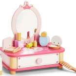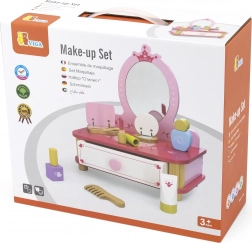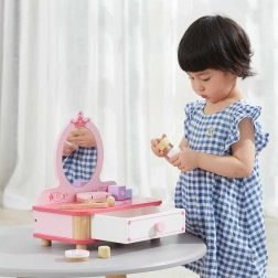 Zestaw zawiera drewniane akcesoria, takie jak szminki, perfumy i cienie do powiek, aby tworzyć nieskończone scenariusze zabaw.