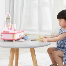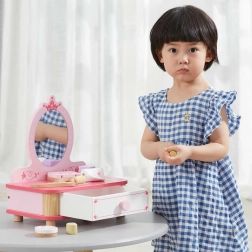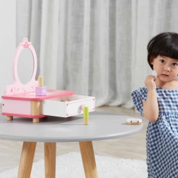 Drewniana toaletka Viga oferuje lustro i pojemną szufladę, gdzie małe księżniczki mogą przechowywać swoje skarby. Różowe wykonanie nadaje produktowi elegancki wygląd i doskonale wkomponuje się w dziecięcy pokój.