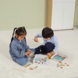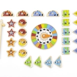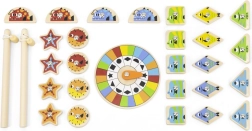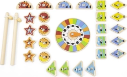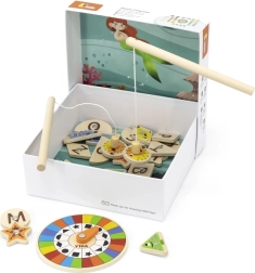Ta drewniana magnetyczna gra w łowienie zamienia naukę w zabawę. Dzieci za pomocą dwóch wędek łowią kolorowe rybki z magnesem i zgodnie z obrotowym kółkiem wybierają właściwy kolor lub kształt. Na odwrocie każdej rybki znajduje się litera alfabetu, dzięki czemu podczas zabawy ćwiczą także pierwsze kroki w umiejętnościach przedczytelniczych.
