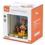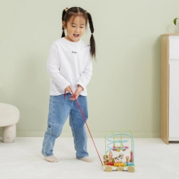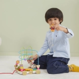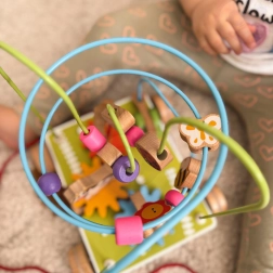 Jedna zabawka, mnóstwo możliwości – dzieci mogą ciągnąć ją za sznurek, przesuwać koraliki po metalowych drucikach i obracać zębatkami. Łączy ruch i zabawę sensoryczną.