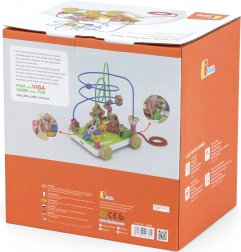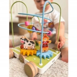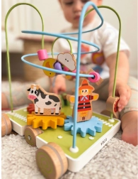Ta kreatywna drewniana zabawka na kółkach oferuje dzieciom niekończące się możliwości odkrywania. Na solidnej podstawie znajdziesz figurki farmera, krówki i pieska, barwną pętlę motoryczną z koralikami, słoneczkiem i motylkiem oraz obrotowe zębatki. Zwierzątka można łatwo wymieniać i przestawiać, dzięki czemu dzieci tworzą własne opowieści i trenują małą motorykę.