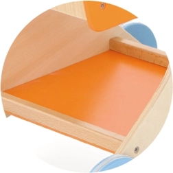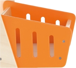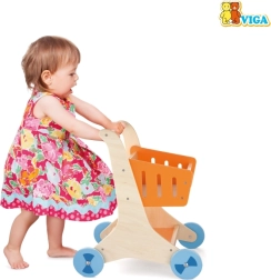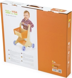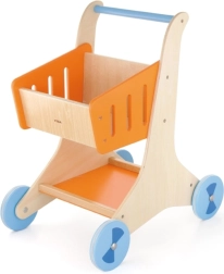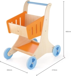 Stylowy drewniany wózek zakupowy z pomarańczowym koszykiem i niebieskimi kółkami jest idealny na pierwsze kroki w świat zabaw w odgrywanie ról. Wspiera rozwój motoryki dużej, równowagi i kreatywnej wyobraźni. Lekka, stabilna konstrukcja z gładkimi krawędziami jest bezpieczna dla dzieci od 12 miesięcy.
