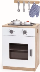 Podaruj dzieciom własny kącik kuchenny, w którym mogą naśladować gotowanie jak dorośli. Ten wysokiej jakości drewniany piekarnik oferuje dwie płyty grzewcze, obrotowe pokrętła i piekarnik z przezroczystymi drzwiczkami dla jeszcze bardziej realistycznej zabawy. Nad płytą znajduje się praktyczna listwa do zawieszania utensyliów i rękawicy.