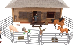 - Stajnia, zagroda, 2 figurki farmerów, 5 zwierzątek (koń, źrebię, świnia, kaczka, królik), akcesoria (np. widły)