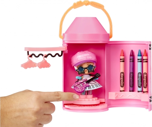 - Lalka, 4 kredki CRAYOLA, 20 papierowych strojów, buty, akcesoria, obrotowa podstawka, wieszak, kapsuła w kształcie kredki