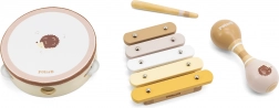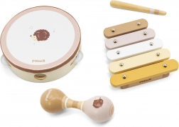 Zestaw zawiera tamburynę, ksylofon z pałeczką i marakasy – wszystko w kompaktowym rozmiarze dla dziecięcych rączek.