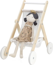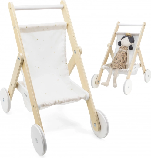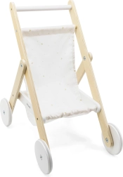 Tekstylny siedzisko z motywem nocnego nieba jest przyjemny w dotyku i łatwy w utrzymaniu. Praktyczny dolny kosz pomieści drobne akcesoria, buteleczki lub ulubione zabawki. Wózek jest idealny dla lalek i pluszaków o wysokości około 38 cm.