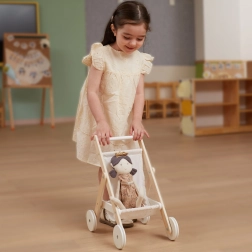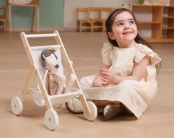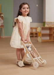 Podaruj dzieciom realistyczną zabawę w rodziców z eleganckim drewnianym wózkiem dla lalek. Łączy ponadczasowy design, wysokiej jakości materiały i bezpieczne wykonanie, aby każdy „spacer” z lalką był wygodny i cichy. Gumowe bieżniki na kołach zmniejszają hałas na podłodze i poprawiają stabilność przy stawianiu pierwszych kroków.