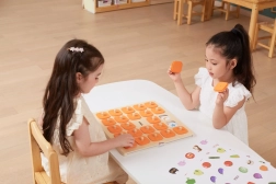 Solidna drewniana plansza z 25 kwadratowymi okienkami oraz pomarańczowymi przykrywkami z uchwytami jest trwała i wygodna dla małych dziecięcych rąk.