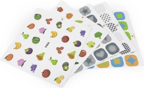Kolorowe karty z motywami kształtów, owoców i zwierząt pozwalają dopasować poziom trudności oraz uczyć dzieci rozpoznawania i klasyfikowania.