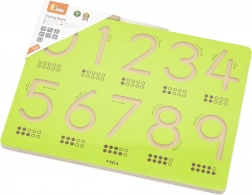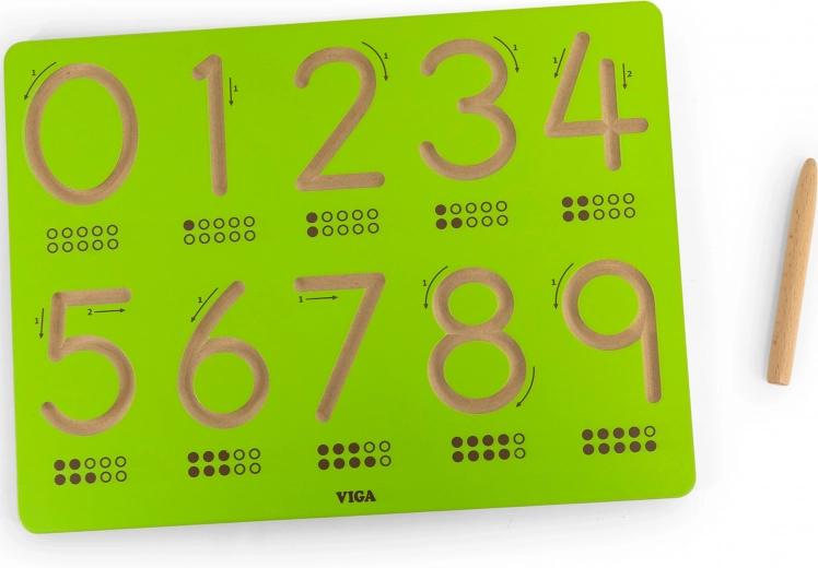 Ta solidna drewniana tablica z frezowanymi cyframi 0–9 to idealna pomoc w pierwszych krokach do nauki pisania. Dziecko, używając drewnianego piórka, podąża po wygiętych rowkach ze strzałkami kierunkowymi, utrwalając prawidłowy kształt cyfr, rytm oraz ślady pamięciowe dla płynniejszego przejścia do pisania ołówkiem.