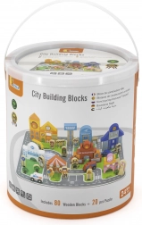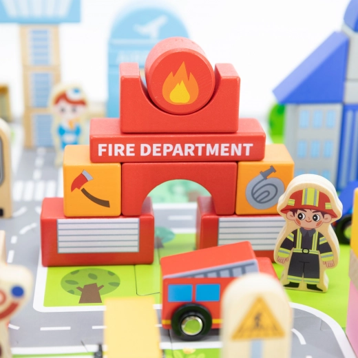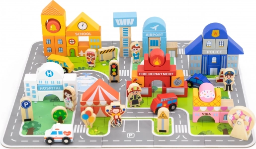 Ta wysokiej jakości drewniana zabawka konstrukcyjna zapewnia dzieciom kompletne miasto na jednej planszy do zabawy. Dzięki 20 elementom puzzli najpierw ułożą drogi i powierzchnie, a następnie z 60 kolorowych klocków zbudują budynki. Nie brakuje pojazdów, figurek różnych profesji oraz dodatków, takich jak drzewa i znaki drogowe, by zabawa była jeszcze bardziej realistyczna.