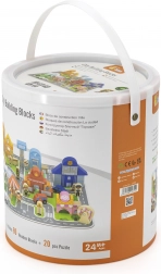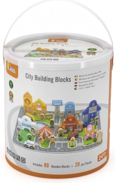 Odkryj kreatywny świat z drewnianą zabawką konstrukcyjną Miasto od marki Viga – kolorowy zestaw z 80 elementami, w tym 20‑częściową podkładką puzzlową, 60 drewnianymi klockami, pojazdami i figurkami. Dzieci zbudują szkołę, szpital, policję, straż pożarną, lotnisko, cukiernię i cyrk, ćwicząc motorykę małą, kreatywność i wyobraźnię. Praktyczne wiadro z uchwytem ułatwia przechowywanie i przenoszenie.