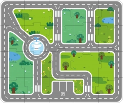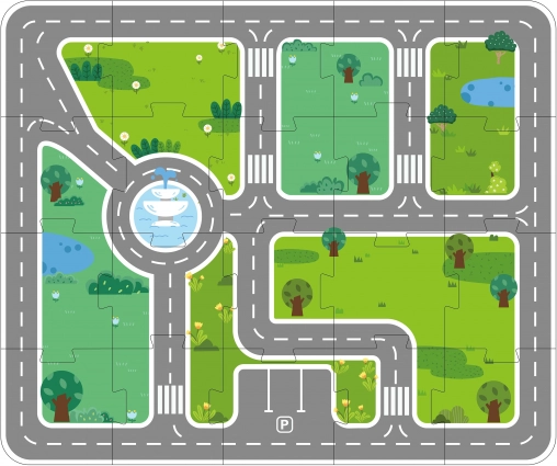 20‑częściowa podkładka z drogami i parkingami tworzy przejrzane środowisko dla wszystkich budowli i pojazdów. Dzieci poćwiczą orientację w przestrzeni oraz zasady ruchu drogowego.