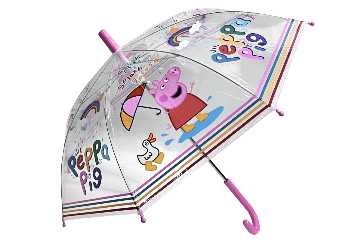 Manualna parasolka z motywem ulubionej postaci Peppy. Wymiary rozłożonej parasolki ok. 65 x 65 x 60 cm. Wymiary opakowania ok. 60 x 8,5 x 4 cm. Zapakowana w foliowy woreczek.