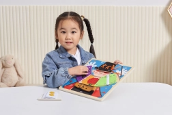 Pod poszczególnymi częściami ubrania ukryte są tematyczne motywy (króliczek, karty, gołębica, bukiet), które rozszerzają zabawę o proste gry pamięciowe i opowiadanie historii. Tablica inspirowana jest zasadami metody Montessori – pobudza ciekawość, wspiera koncentrację i wzmacnia pewność siebie dziecka.