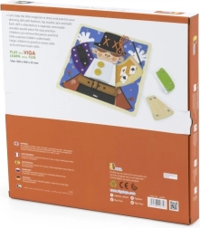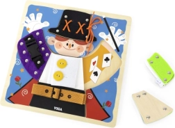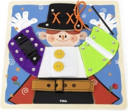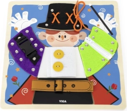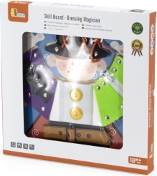 Zabawna drewniana tablica marki VIGA z motywem małego czarodzieja uczy dzieci od 18 miesięcy podstaw ubierania się i samoobsługi. Podczas zabawy ćwiczą zamki błyskawiczne, guziki, napy, klamry i sznurowadła, rozwijają motorykę małą, koordynację ręka–oko oraz samodzielność. Pod ubrankami ukryte są również czarodziejskie elementy, które posłużą jako wesoła aktywność pamięciowa.