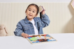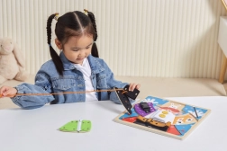 Zamki, guziki, napy, klamry i sznurowanie – dziecko wypróbuje różne rodzaje zapięć i naturalnie utrwali umiejętności samoobsługowe.