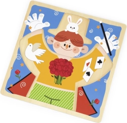 Pod elementami ubrania kryją się czarodziejskie motywy (króliczek, karty, gołębica, bukiet), które wspierają pamięć, koncentrację i wyobraźnię.
