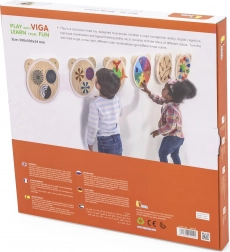 Nacisk na bezpieczeństwo i jakość: produkt wykonany z trwałego, lakierowanego drewna i malowany nietoksycznymi, żywymi farbami. Zabawa naturalnie rozwija małą motorykę, koordynację, logiczne myślenie oraz wspiera rozpoznawanie kolorów. W ofercie znajduje się cała seria ściennych tablic w kształcie misia z różnymi funkcjami – idealne do modułowego kącika sensorycznego.