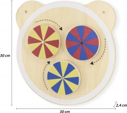 Drewniana tablica z uroczą głową misia zamieni każdy dziecięcy kącik w kreatywną bawialnię. Trzy kolorowe kółka można łatwo obracać, obserwując imponujące efekty optyczne, które angażują dzieci i zachęcają do dalszego odkrywania. Tablica idealna do pokoju dziecięcego, przedszkoli i kącików zabaw.
