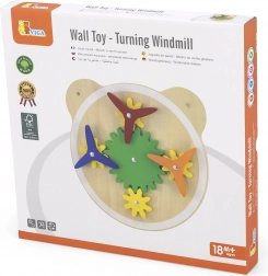 Pięć kolorowych kół zębatych i trzy wiatraczki są ze sobą połączone. Dziecko zrozumie zasadę przyczyny i skutku, gdy jednym ruchem wprawi w ruch cały mechanizm.