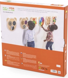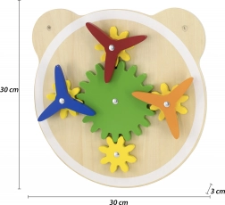 Drewniana tablica w kształcie głowy misia łączy pięć połączonych kół zębatych i trzy wiatraczki. Dzieci poprzez zabawę przyswajają zasadę przyczyny i skutku: po obróceniu jednego koła poruszają się wszystkie. Naturalnie trenują motorykę małą, percepcję wzrokową oraz współpracę zespołową, gdy wymieniają się przy jednym panelu.