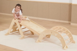 Wysoka jakość wykonania z naturalnego drewna z gładkimi krawędziami oraz wykończeniem nietoksycznymi farbami zapewnia długą żywotność i bezpieczeństwo. Łuk można łączyć z innymi elementami montessori (np. trójkątem czy zjeżdżalnią), tworząc domowy mini plac zabaw.