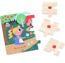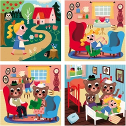 Cztery osobne puzzle po 9 elementów opowiadają baśń o Złotowłosej krok po kroku i wspierają dziecięcą wyobraźnię oraz opowiadanie.