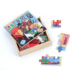 Ten zestaw zawiera 4 ilustrowane obrazki z baśni o Złotowłosej, każdy złożony z 9 solidnych elementów. Dzieci poćwiczą koncentrację, pamięć i cierpliwość, a jednocześnie nacieszą się pięknymi, kolorowymi ilustracjami w retro stylu autorstwa Ingeli P. Arrhenius. Dzięki drewnianemu wykonaniu puzzle są trwałe i odpowiednie dla małych dziecięcych rąk.