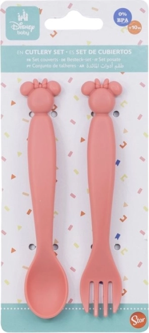 Zestaw dwóch plastikowych sztućców dla dzieci z zakończeniami w kształcie Minnie.