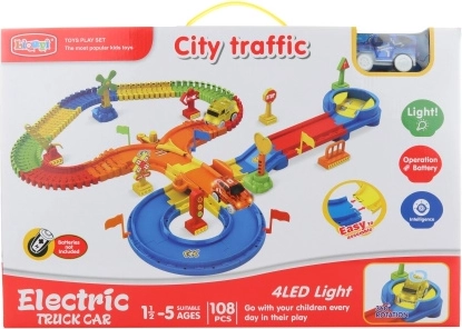 Ta droga z autkiem jest wykonana z wysokiej jakości plastiku i jest zaprojektowana dla dzieci już od 18 miesiąca życia. Po włożeniu 1 baterii AA (nie jest częścią zestawu) autko zapala się i zaczyna jeździć po drodze. Zestaw zawiera w sumie 108 elementów, co pozwala na budowanie różnorodnych kształtów i torów, które dzieci będą odkrywać. Dzięki swoim rozmiarom droga jest łatwo przenośna i można ją łatwo przechowywać lub rozłożyć w zależności od potrzeby.