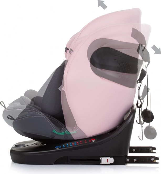 Ten fotelik i-Size rośnie wraz z dzieckiem od noworodka do wzrostu 150 cm. Dzięki solidnemu montażowi ISOFIX oraz dodatkowemu Top Tether (40–105 cm) zapewnia maksymalną stabilność. Obrót 360° na bazie ułatwia wsiadanie oraz przełączanie między jazdą tyłem (40–105 cm) a przodem do kierunku (100–150 cm, możliwy także montaż pasem samochodowym).