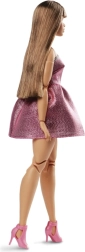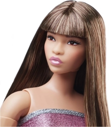 Lalka Barbie ma gładkie brązowe włosy z prostą grzywką, wyraziste brwi i rozświetlający makijaż, który dopełnia jej wygląd.
