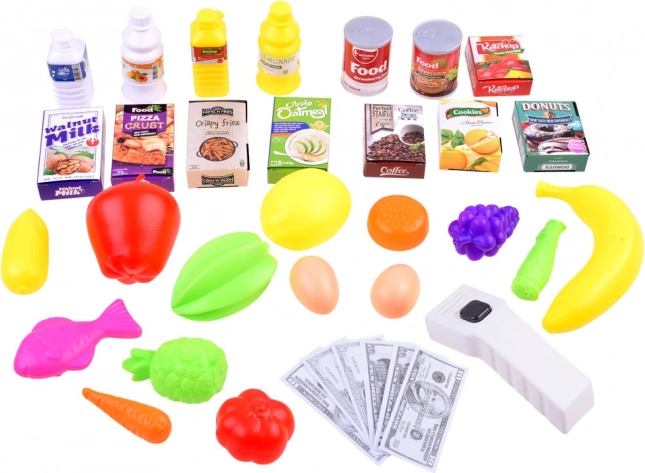 W zestawie bogate wyposażenie: pudełka z żywnością (kawa, owsianka, ciastka, pączki, makaron, keczup, mąka do pizzy, mleko orzechowe), butelki (mleko, sok owocowy, sos pomidorowy, kwas cytrynowy), puszki (dżem truskawkowy, kukurydza), różne rodzaje owoców i warzyw, ryba i jajka. Produkty są zabawkami – nie są przeznaczone do spożycia.
