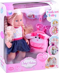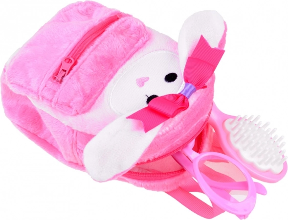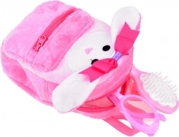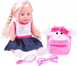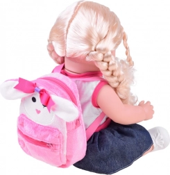 Lalka łatwo siedzi i stoi z podparciem. Różowe okulary i pluszowy plecaczek z uszkami króliczka pobudzają wyobraźnię i dodają uroczego stylu.