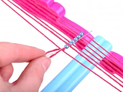 Różowo-niebieskie krosno trzyma nici stabilnie na miejscu i umożliwia wygodne nawlekanie koralików oraz tworzenie równych wzorów.