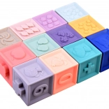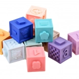 Miękkie, sensoryczne kostki w pastelowych barwach zachęcają do odkrywania dotykiem i wzrokiem. Każda kostka ma reliefowe kształty, zwierzątka i cyfry, które stymulują zmysły i w zabawny sposób uczą rozpoznawania kształtów, kolorów oraz pierwszych liczb. Dzięki elastycznej strukturze sprawdzą się także jako bezpieczny gryzak.
