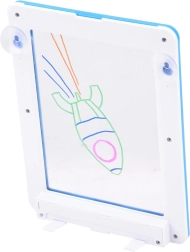 Tablica jest lekka, przenośna i idealna do domowych prac plastycznych, zabawy oraz dekoracji pokoju dziecięcego. Neonowe flamastry w intensywnych kolorach (zielony, niebieski, pomarańczowy, różowy) zapewniają wyraziste linie, a ściereczka umożliwia szybkie ścieranie i tworzenie od nowa. Przyssawki pozwalają łatwo przymocować tablicę do gładkiej powierzchni.