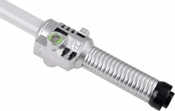 Ergonomiczna srebrna rękojeść z przyciskiem do aktywacji światła i dźwięku zapewnia pewny chwyt i intuicyjne użytkowanie.