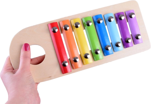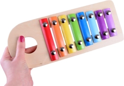 Ten drewniany ksylofon zawiera 8 metalowych płytek, które umożliwiają zagranie całej gamy. Dzieci mogą delikatnie stukać pałeczką, uzyskując lekkie tony, lub mocniej, aby otrzymać głośniejszy dźwięk, tworząc w ten sposób angażujące, muzyczne doświadczenie.