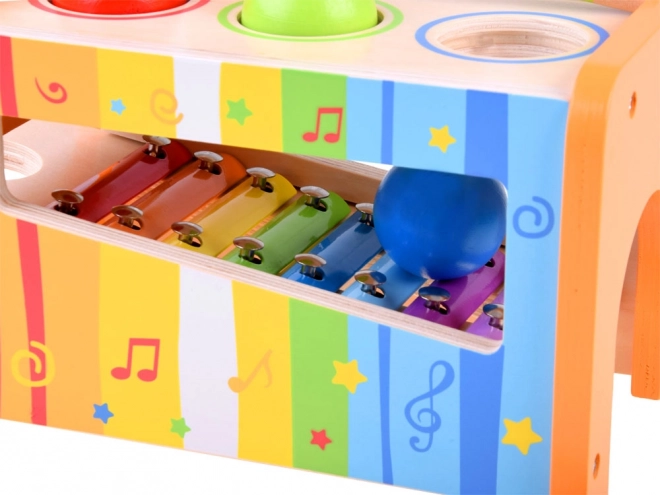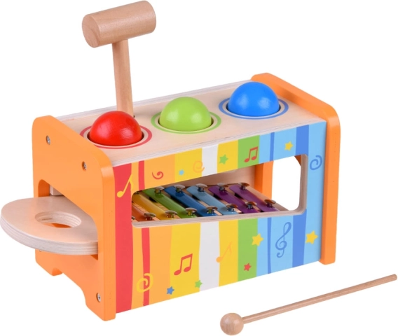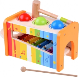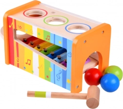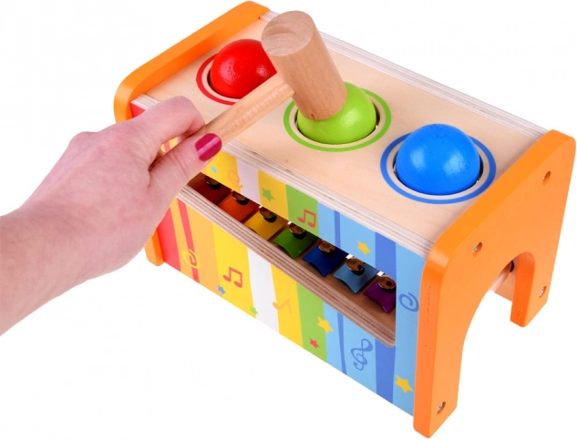 Dzieci mogą młoteczkiem wbijać kolorowe kulki w otwory konstrukcji, które po upadku na ksylofon wydają różne dźwięki. Ta aktywność rozwija umiejętności motoryczne i wrażliwość muzyczną.