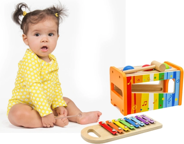 Drewniany ksylofon i młoteczek wspierają nie tylko rozwój muzyczny, ale także umiejętności motoryczne dzieci.