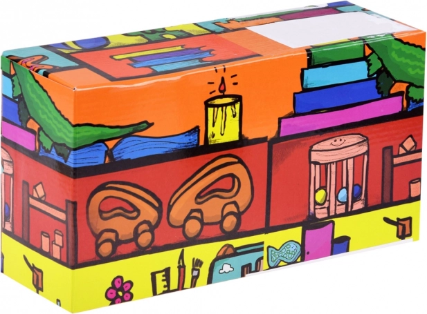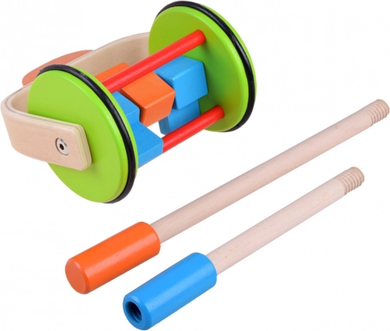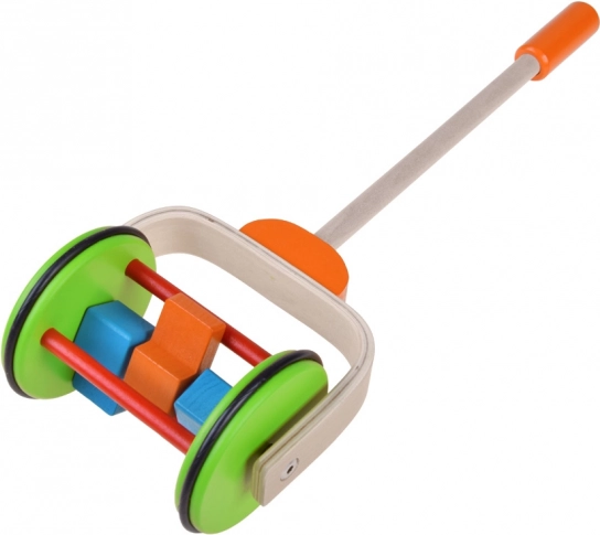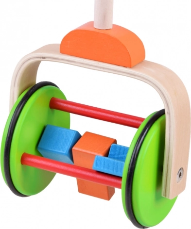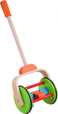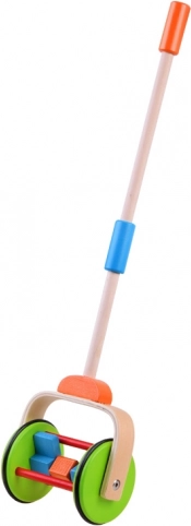 Kolorowa drewniana zabawka do pchania została zaprojektowana tak, aby wspierać dzieci w ich pierwszych kroczkach. Ma uchwyt dopasowany do wzrostu dziecka z możliwością regulacji. Koła są pokryte gumowym paskiem, co zapewnia płynny ruch i ochronę podłogi.