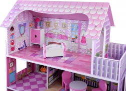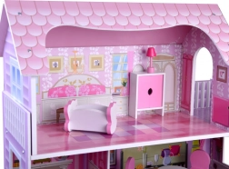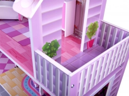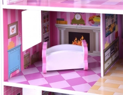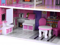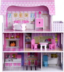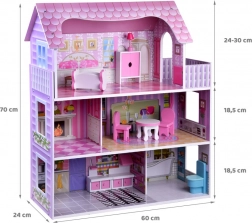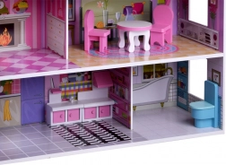 Różowo‑fioletowy drewniany domek dla lalek zachwyca dopracowanymi ilustracjami i otwartą architekturą dla łatwego dostępu do każdego pokoju. Trzy piętra oferują pięć w pełni wyposażonych stref oraz taras, zachęcając do długich godzin wyobraźniowej zabawy. Dzięki stabilnej drewnianej konstrukcji i przemyślanym proporcjom to idealne centrum dziecięcego pokoju.