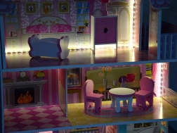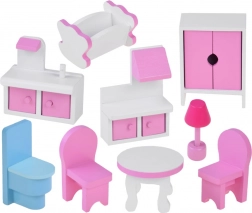 - Zestaw mebli: kredens z okapem i otwieranymi drzwiczkami, szafka łazienkowa z drzwiczkami, niebieska toaleta, biały okrągły stół, 2 różowe krzesła, biała szafa z różowymi drzwiczkami, kołyska, lampka nocna oraz oświetlenie LED.